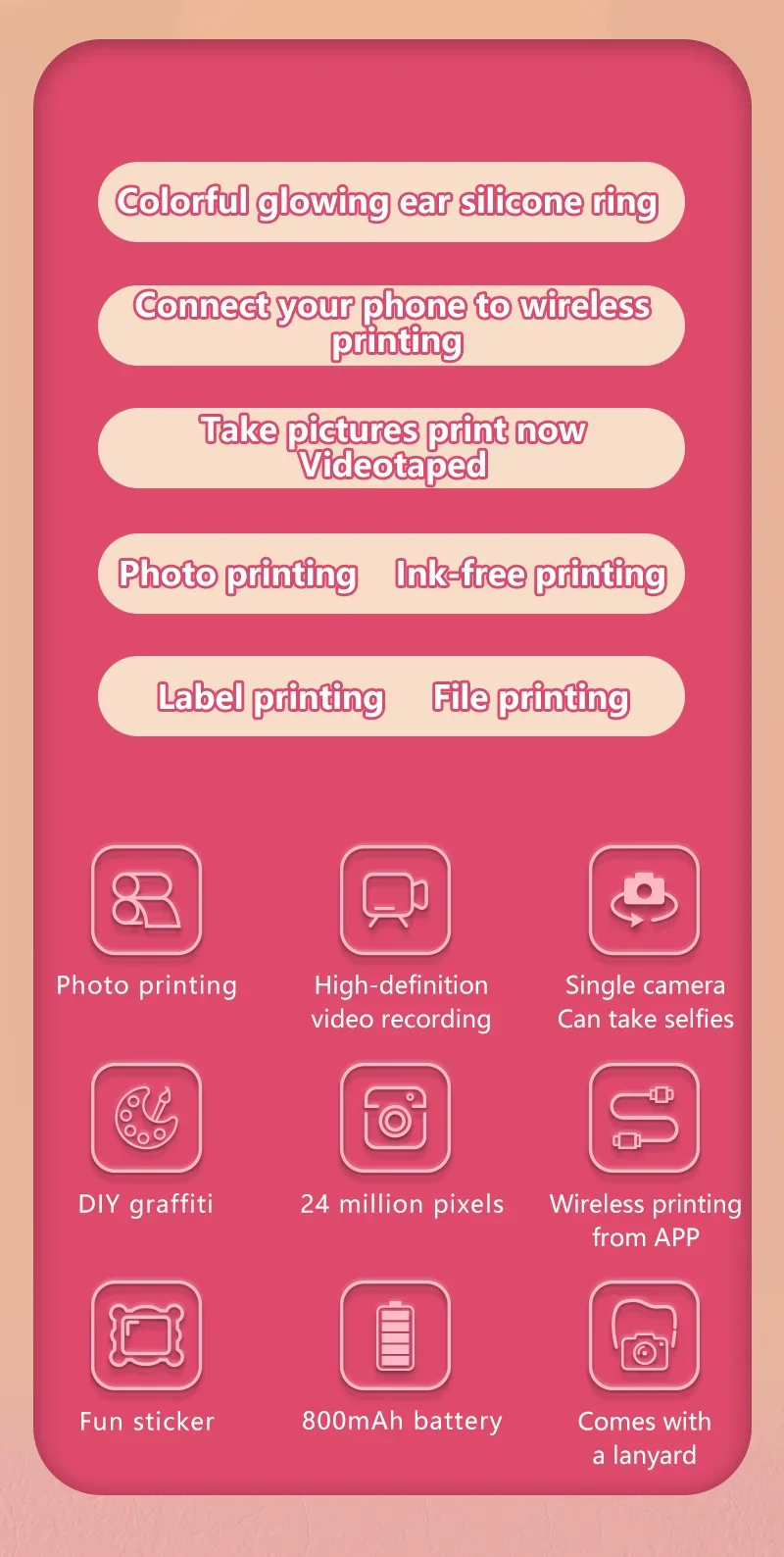 Com um toque simples, capture imagens nítidas e coloridas, e o mais incrível, imprima-as instantaneamente! Perfeito para crianças que gostam de brincar com fotos e vídeos.