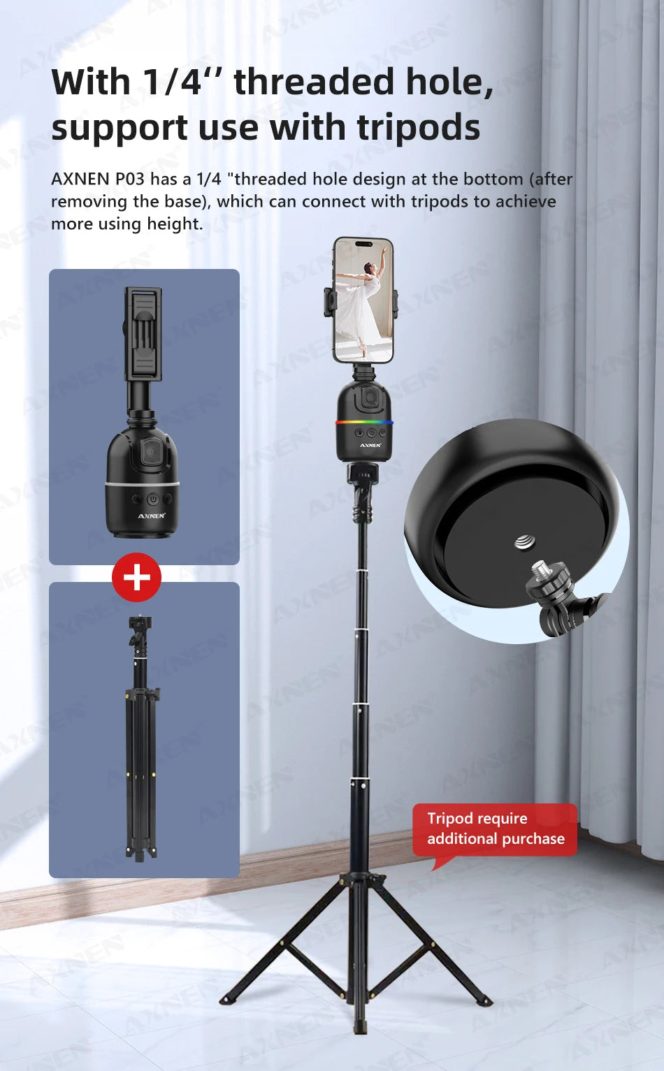 AXNEN P03 features a 1/4" threaded hole at the bottom (after removing the base), allowing connection with tripods to achieve greater height and versatility.